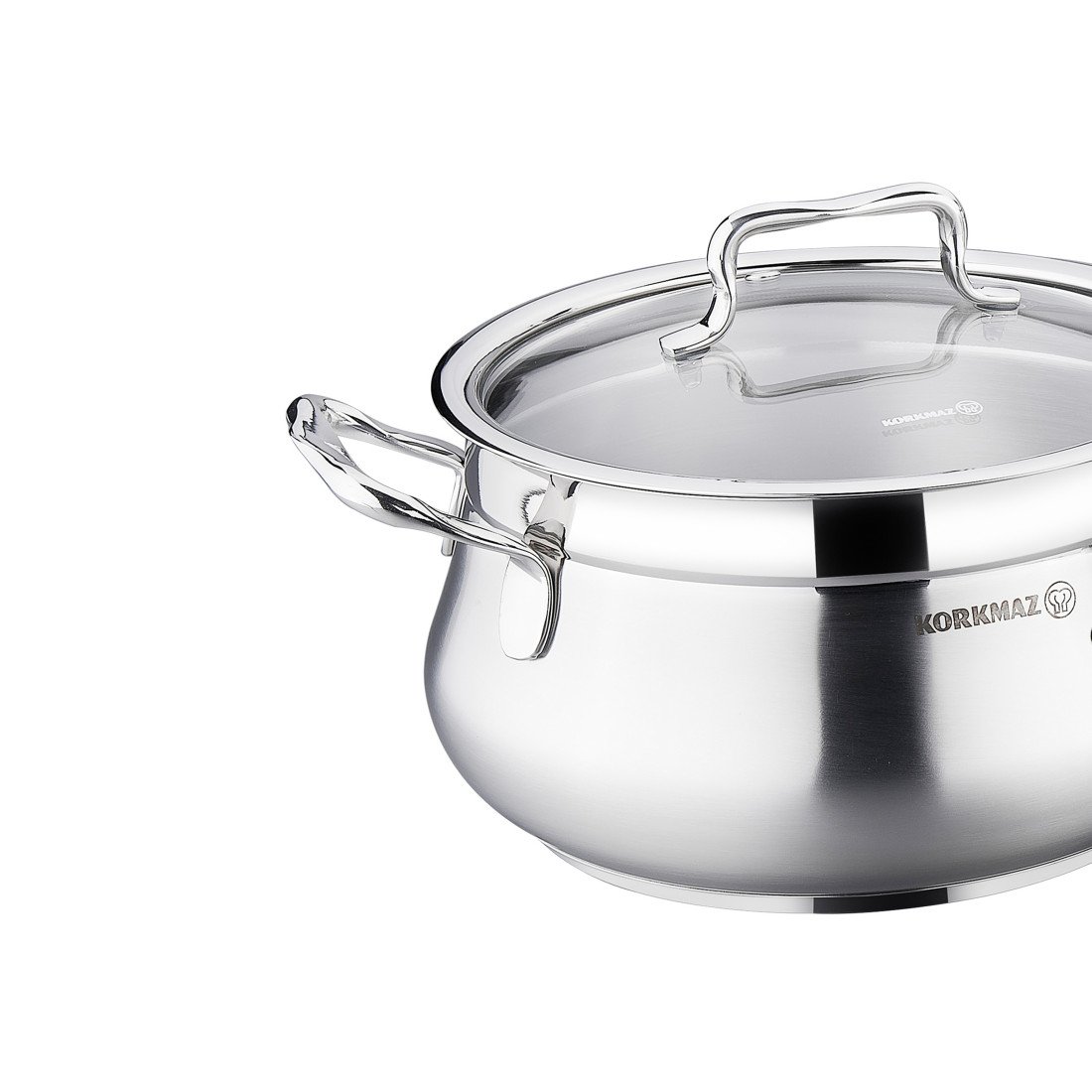 كوركماز إستيما مجموعة قدور KORKMAZ المصنوعة من الستانلس ستيل،تتميز هذه القدور بقاعدتها المصممة لتوزيع الحرارة بشكل متساوٍ وسريع، ومقابض مريحة وآمنة لليد، وأغطية محكمة الإغلاق، بالإضافة إلى سهولة تنظيفها وآمنة للغسل في غسالة الأطباق.